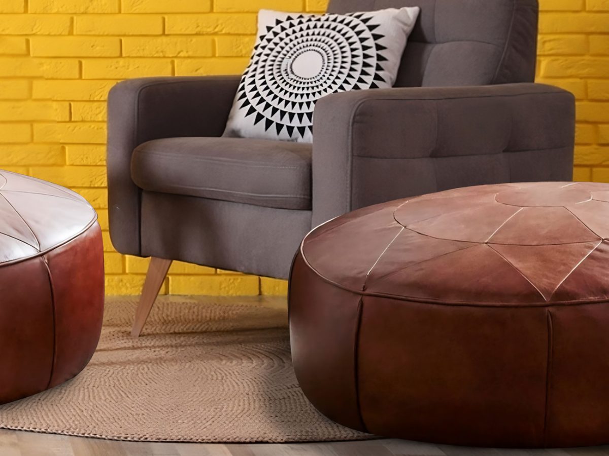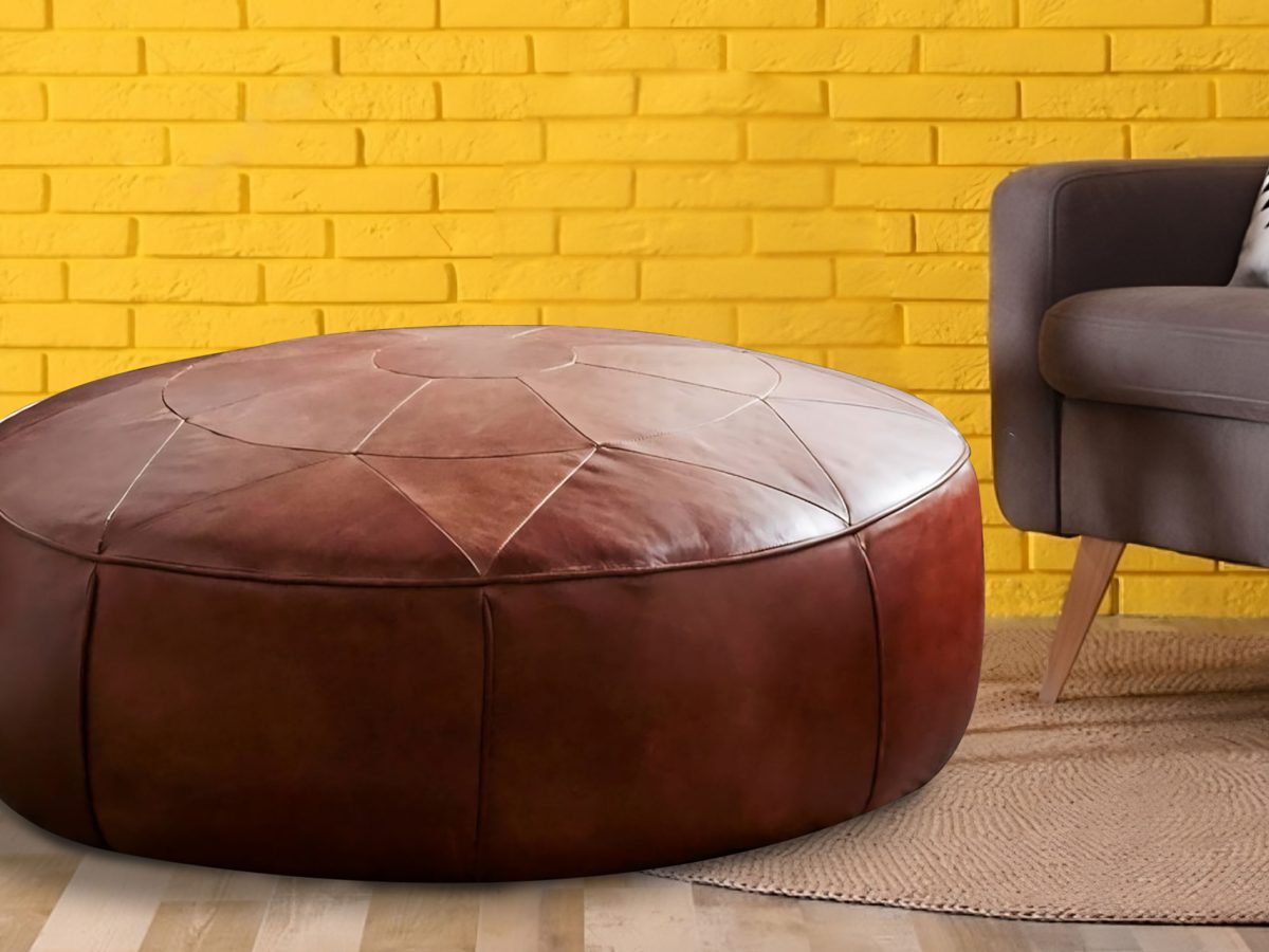 Enhance the allure of your living space with the exotic charm of our Moroccan leather pouf. Meticulously handcrafted from genuine leather, this pouf boasts a captivating compass design on its surface. Filled with a combination of cotton and wool, it ensures both comfort and durability, making it an ideal seating option.